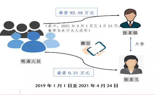 (一)利用微信账户接收毒资。2019年1月1日至2021年4月24日期间,张某强利用其微信账户共接收毒资92.48万元,其中2021年3月1日至2021年4月24日期间共接收微信账户转入的毒资共计9.6万元人民币;张某兰利用其微信账户在2019年1月1日至2021年4月24日期间接收毒资0.21万元。