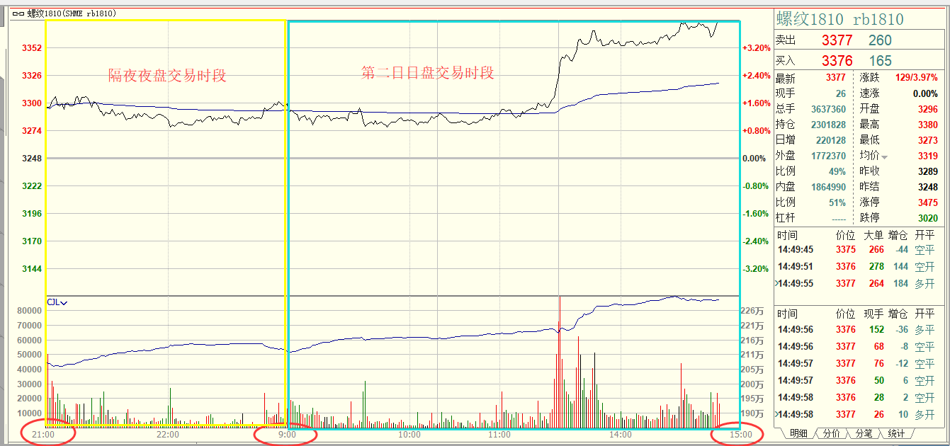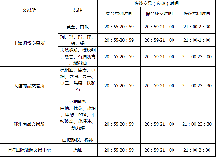 头天夜盘为交易时段第一节。在20:55-20:59进行竞价,20:59-21:00进行撮合成交。