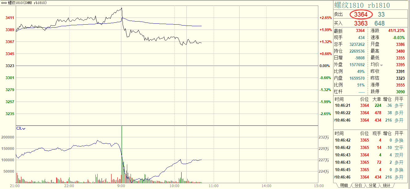 买入开仓一手螺纹1810,成交价3364,交易单位10吨/手,保证金率14%。