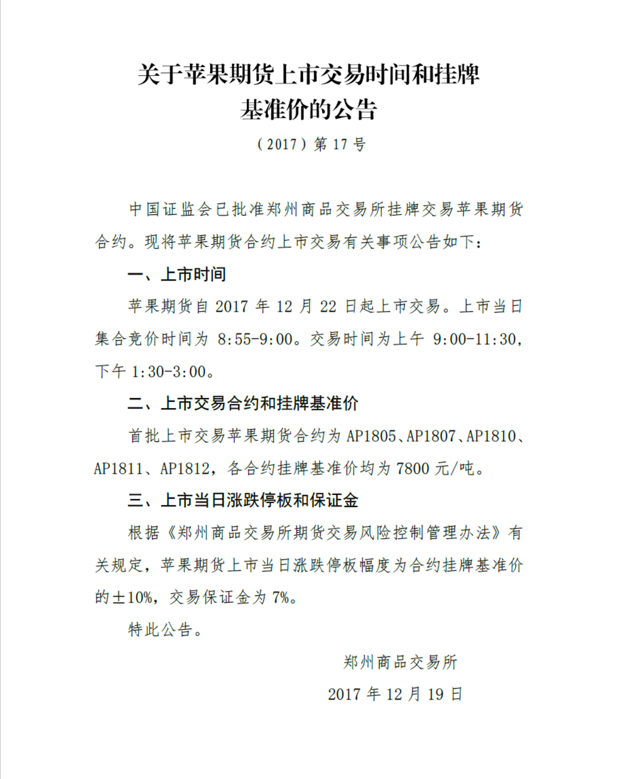 关于苹果期货上市交易时间和挂牌基准价的公告
