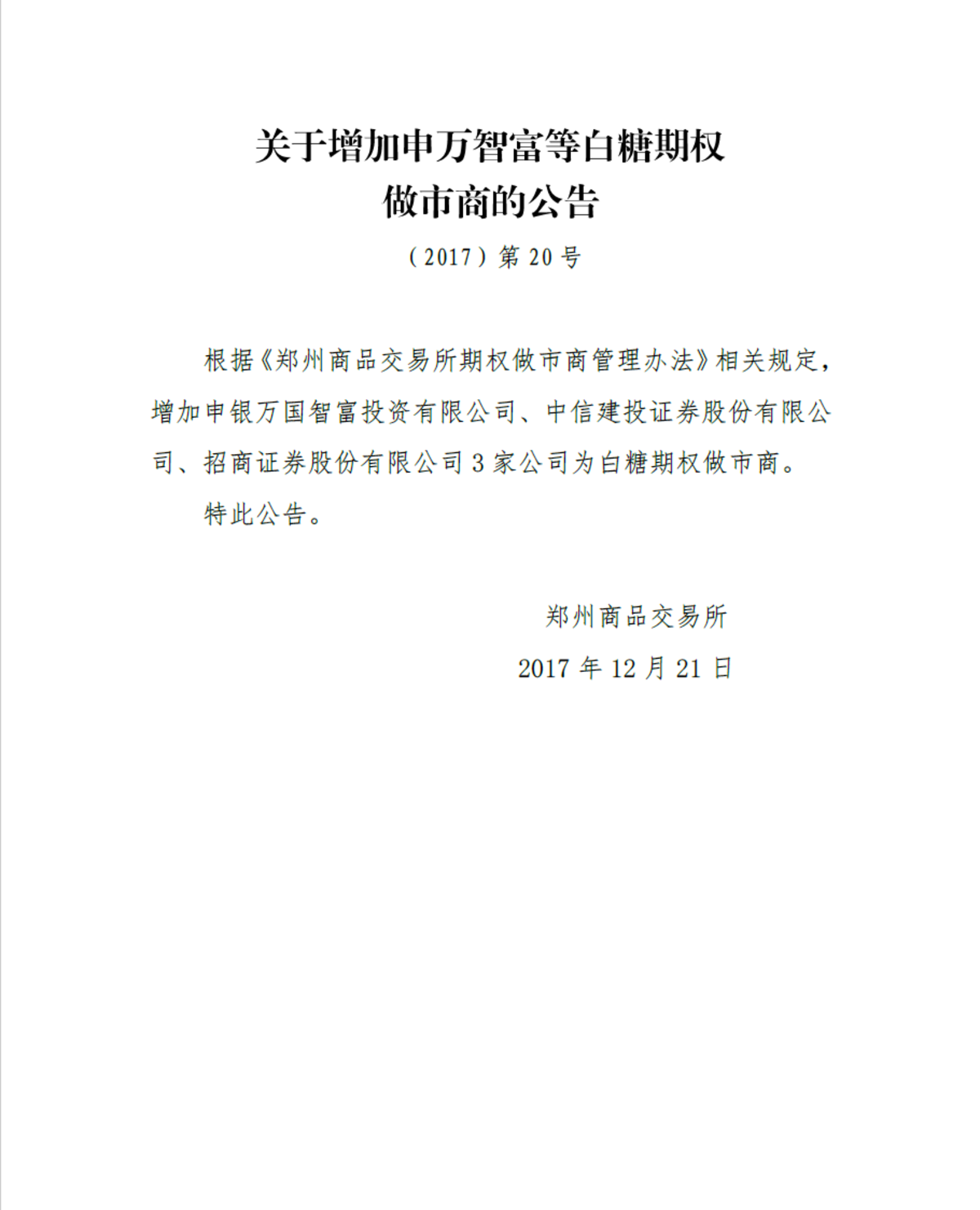 (郑商所)关于增加申万智富等白糖期权做市商的公告