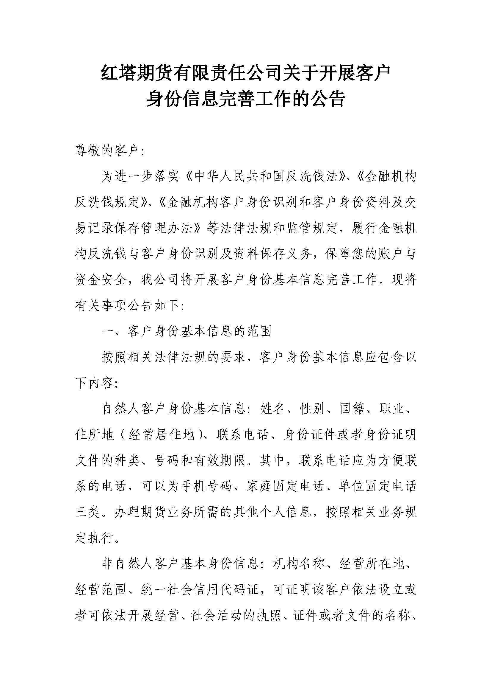 红塔期货关于开展客户身份信息完善工作的公告|公司公告|红塔期货有限责任公司-晓游棋牌