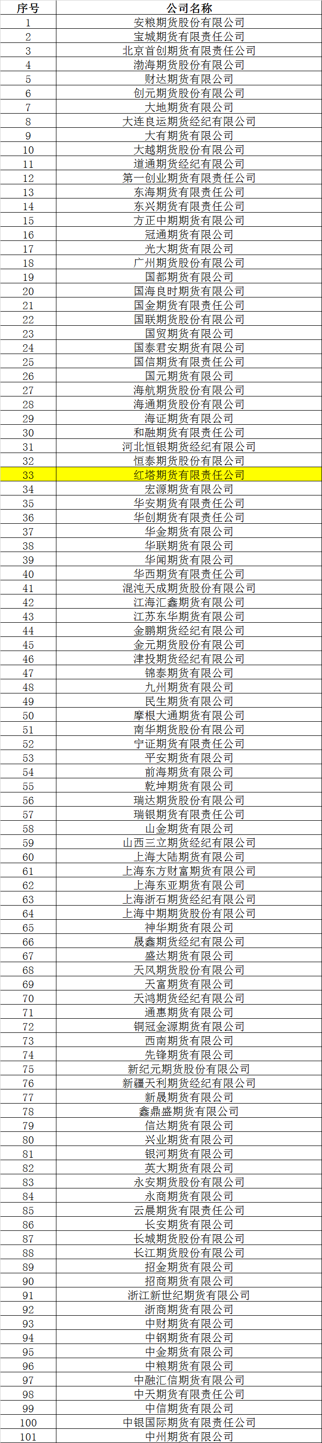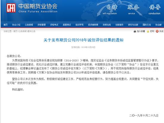 新浪财经讯 10月29日,中国期货业协会发布关于期货公司2018年诚信评估结果的通知,通知称,为贯彻国务院《社会信用体系建设规划纲要(2014-2020)》精神,落实证监会《证券期货市场诚信监督管理暂行办法》要求,推进期货行业诚信建设,优化行业诚信环境,建立完善行业诚信评估机制,中国期货业协会(以下简称“协会”)在征求行业意见的基础上,经理事会审议通过发布了《期货公司诚信评估方案》(以下简称《方案》),用于规范和指导期货行业诚信评估、结果使用等具体工作。现根据《方案》在协会网站发布期货公司2018年诚信评估结果,请各期货公司予以关注。